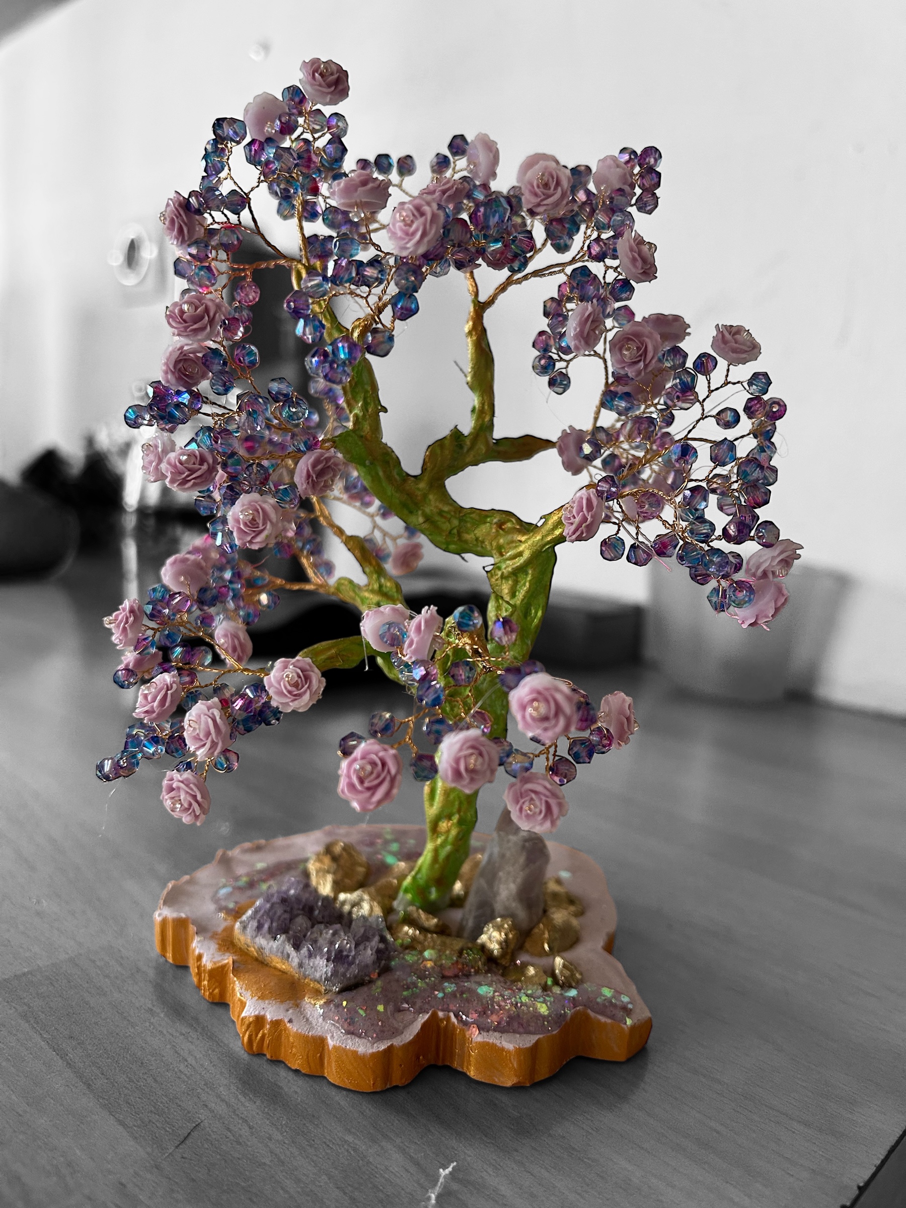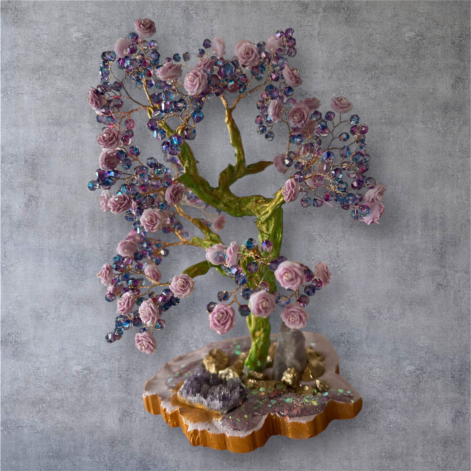 Le tronc, travaillé avec minutie et peint à la main, s’enracine solidement dans un socle en plâtre et résine, décoré de paillettes scintillantes qui évoquent un sol enchanté. Pour enrichir cette composition, un amas de cristaux naturels et une pointe d’améthyste viennent renforcer l’énergie spirituelle et vibratoire de l’œuvre. L’améthyste, pierre de sagesse et de sérénité, favorise l’équilibre intérieur et la méditation, tout en diffusant des ondes apaisantes.
