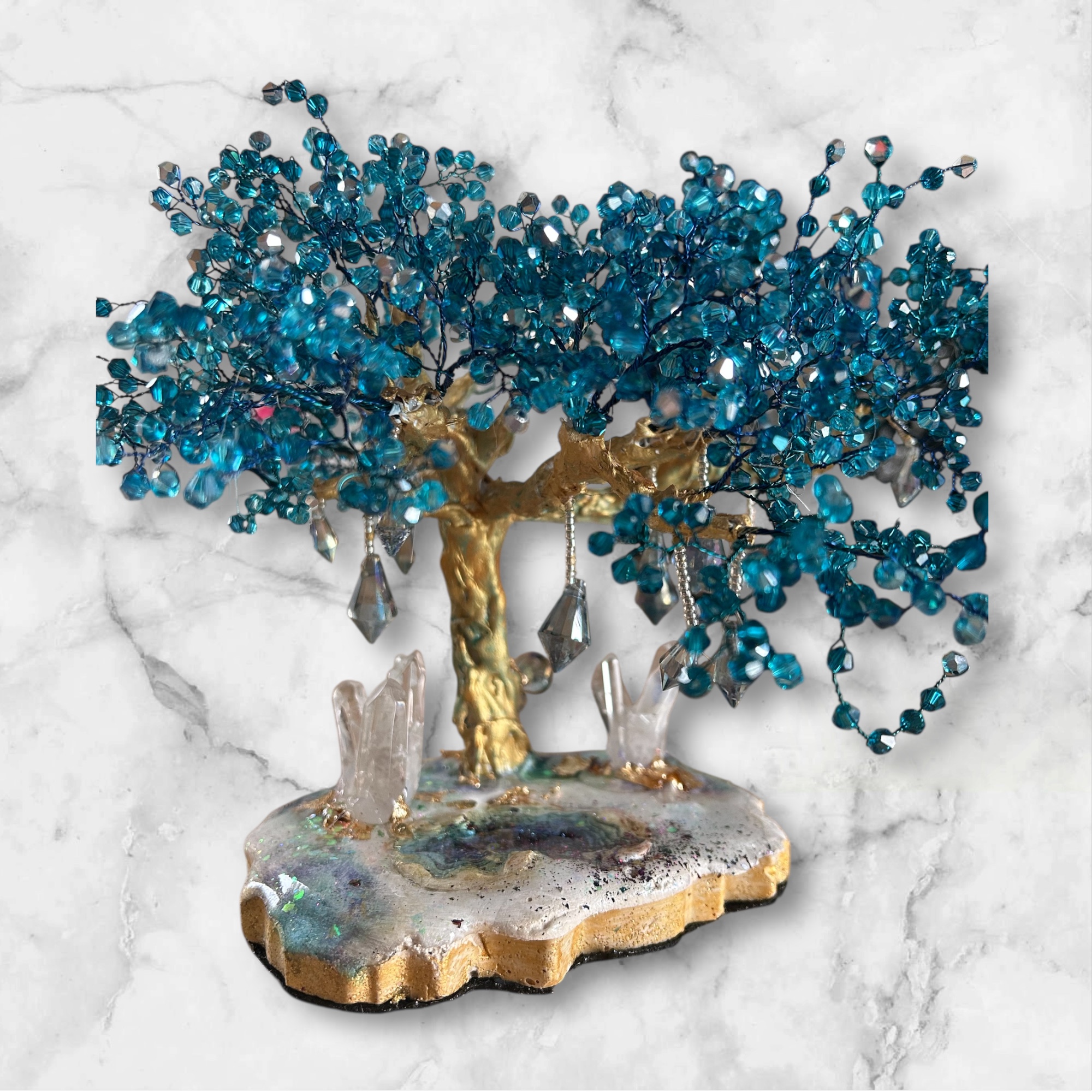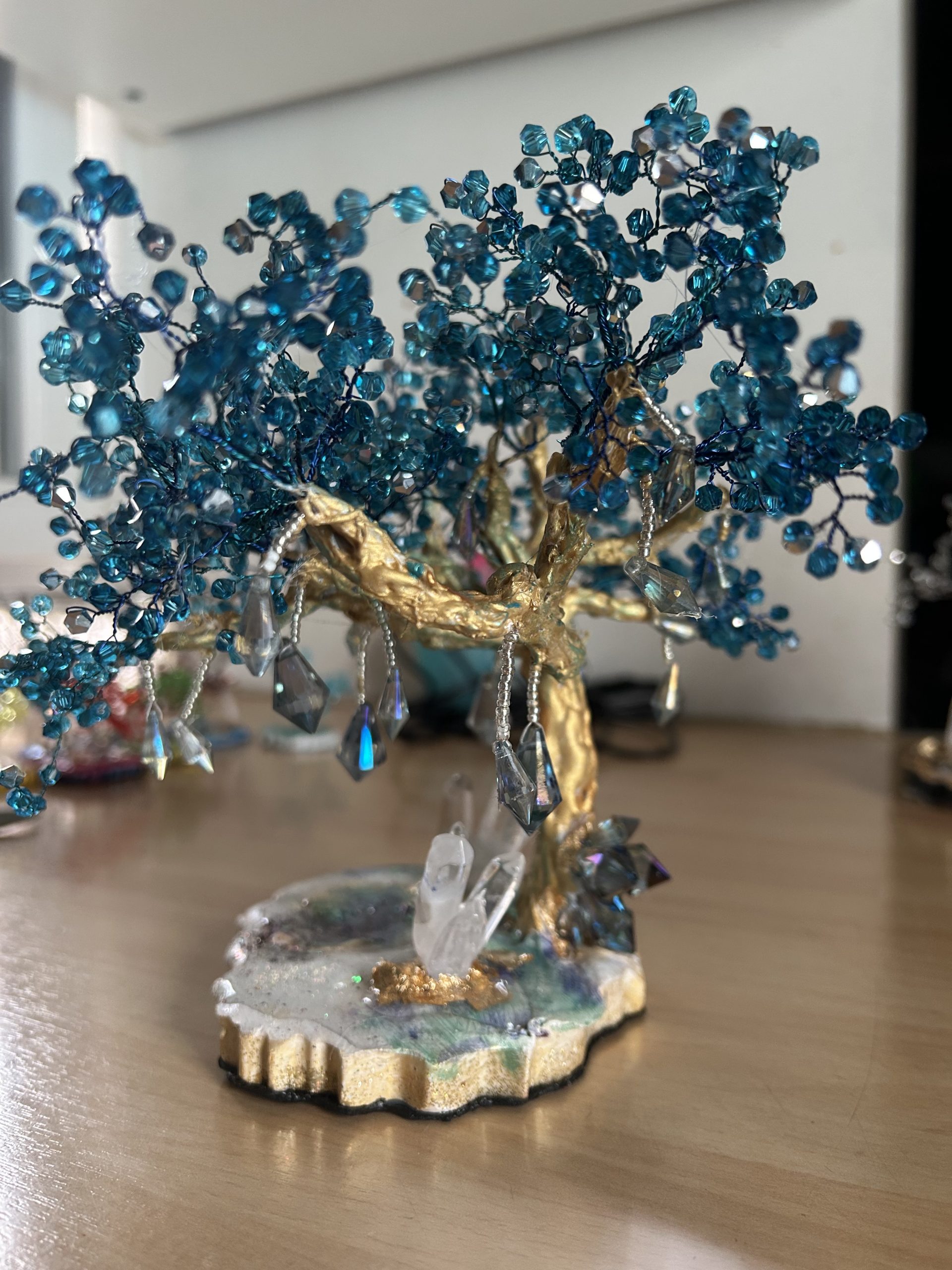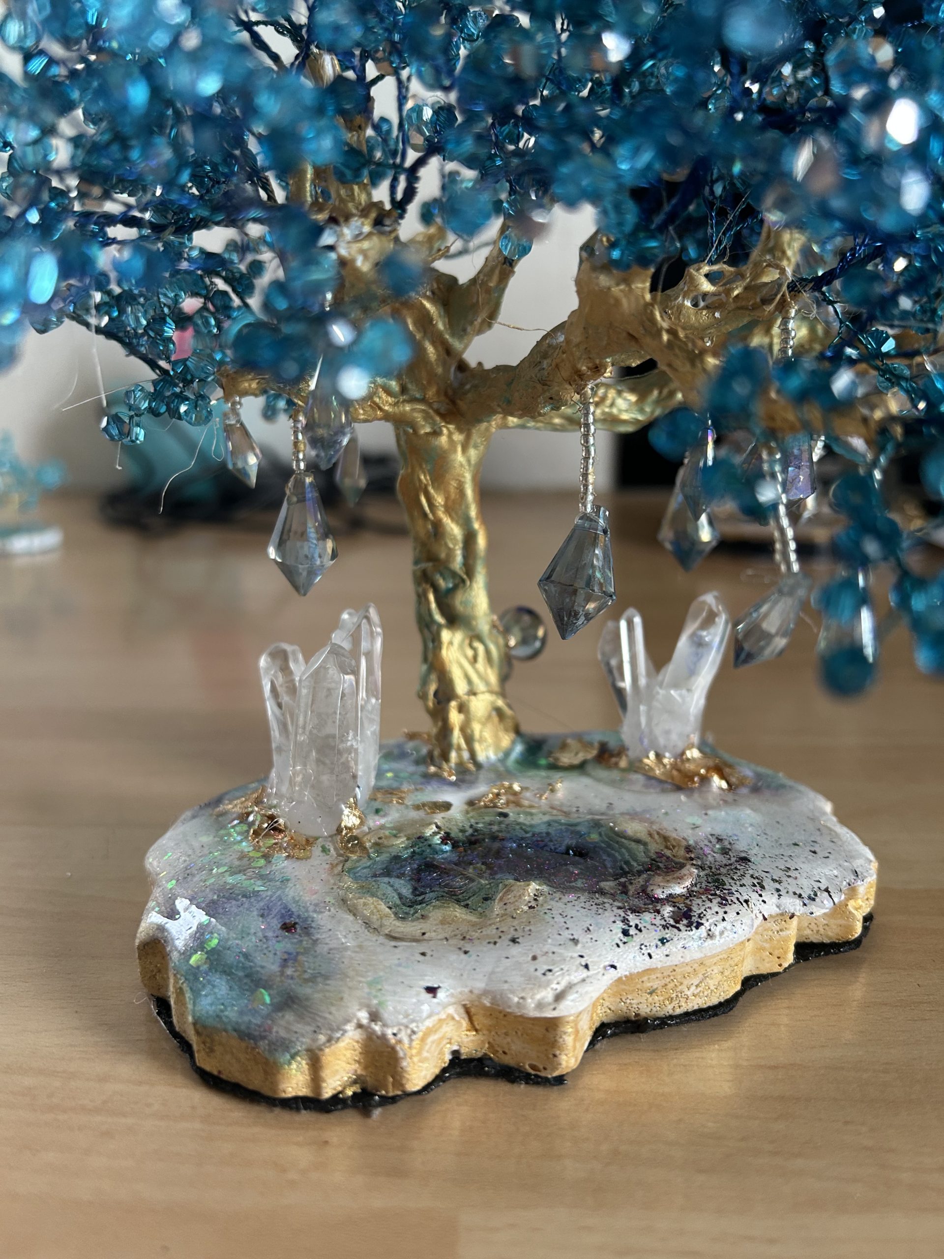 Symbole universel de force, d’ancrage et d’harmonie, cet arbre de vie unique est entièrement façonné à la main. Son tronc doré, sculpté avec soin, supporte un feuillage éclatant composé de perles en cristal autrichien bleu intense. Chaque facette capte la lumière et crée des reflets hypnotiques, rappelant l’éclat des cascades célestes et la profondeur des océans.