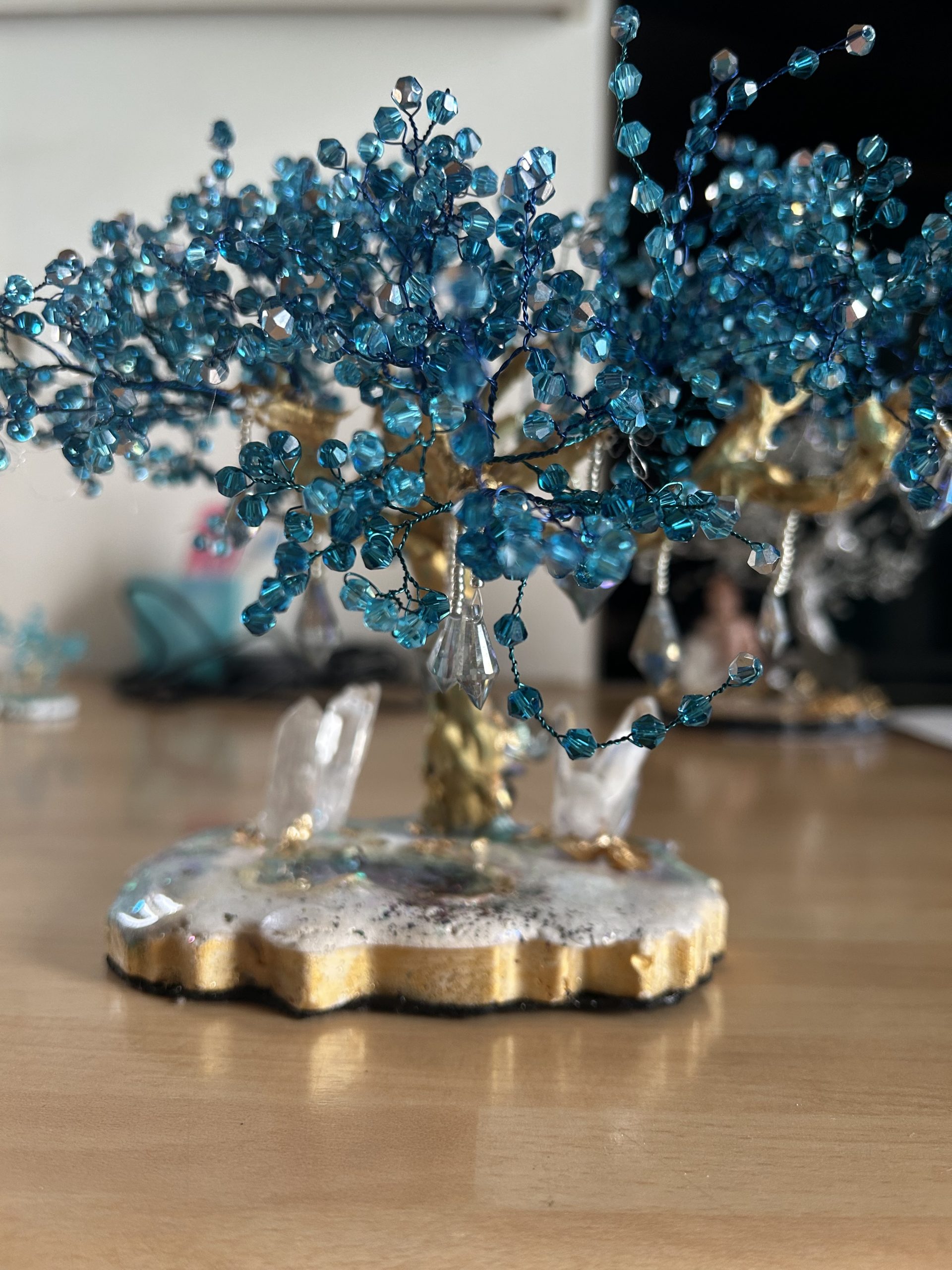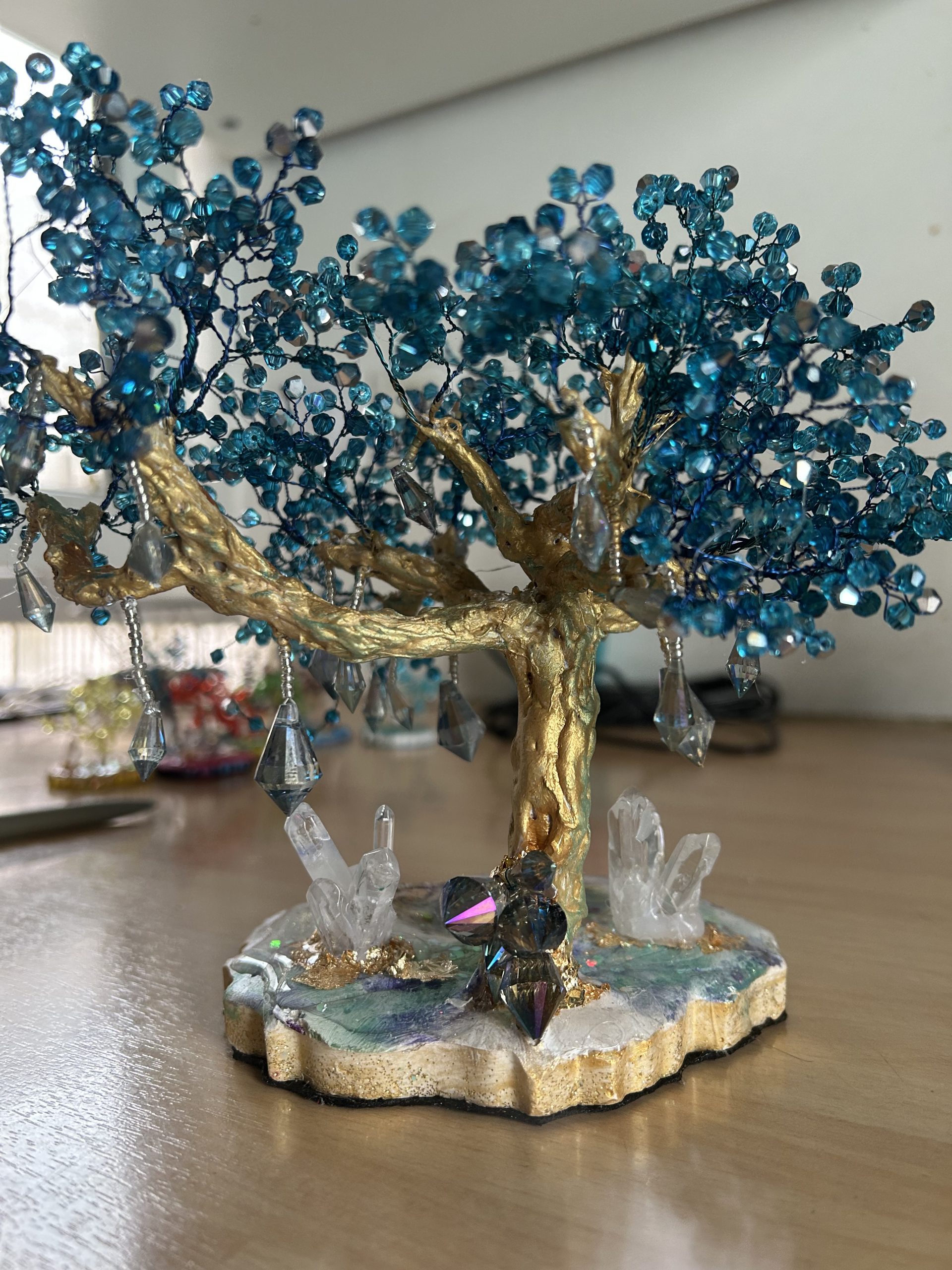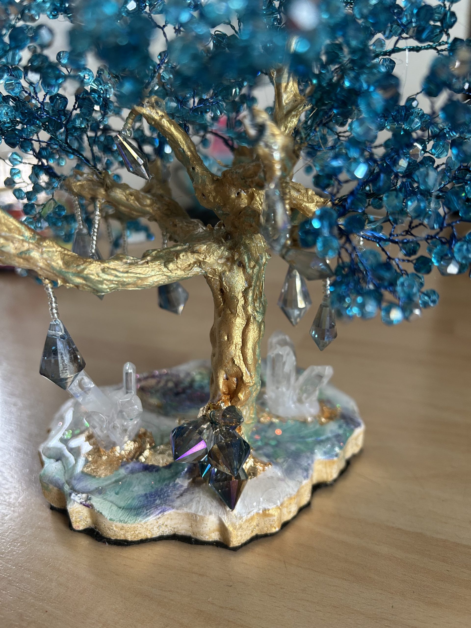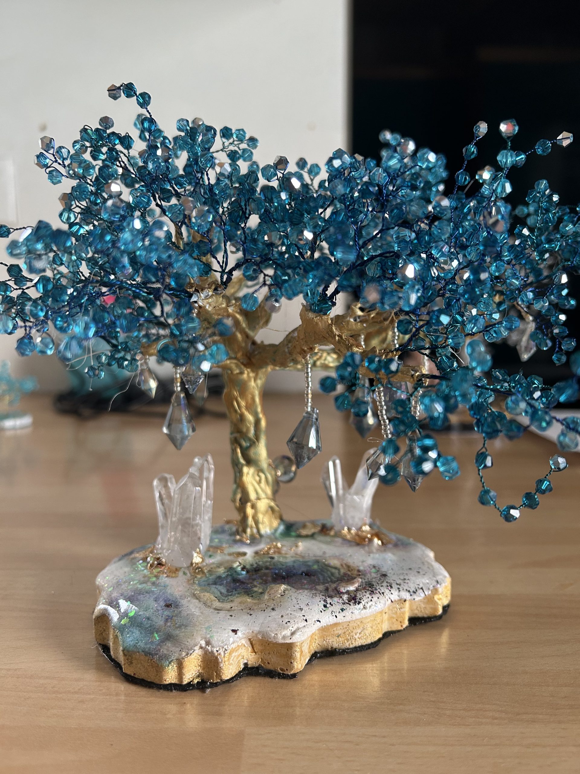 Symbole universel de force, d’ancrage et d’harmonie, cet arbre de vie unique est entièrement façonné à la main. Son tronc doré, sculpté avec soin, supporte un feuillage éclatant composé de perles en cristal autrichien bleu intense. Chaque facette capte la lumière et crée des reflets hypnotiques, rappelant l’éclat des cascades célestes et la profondeur des océans.