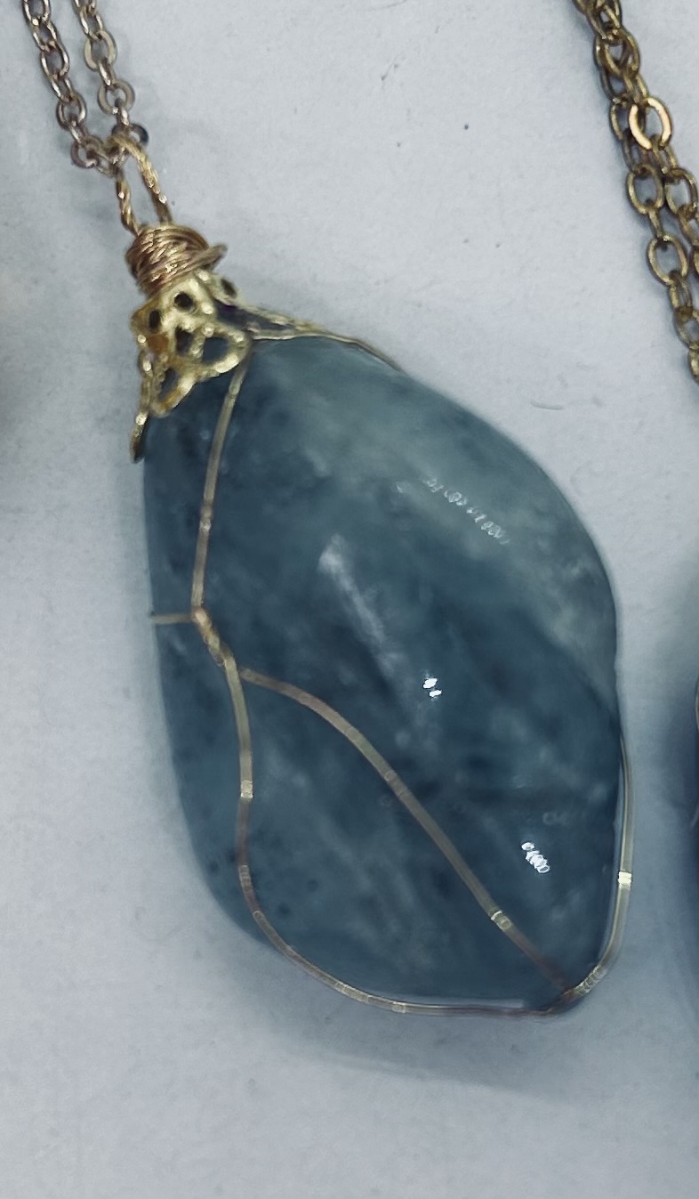 La pierre est enveloppée dans un filet de fils de laiton doré, qui souligne ses courbes naturelles tout en lui apportant une touche artisanale et délicate. Une petite calotte décorative dorée vient sublimer l’ensemble et en renforce le raffinement.