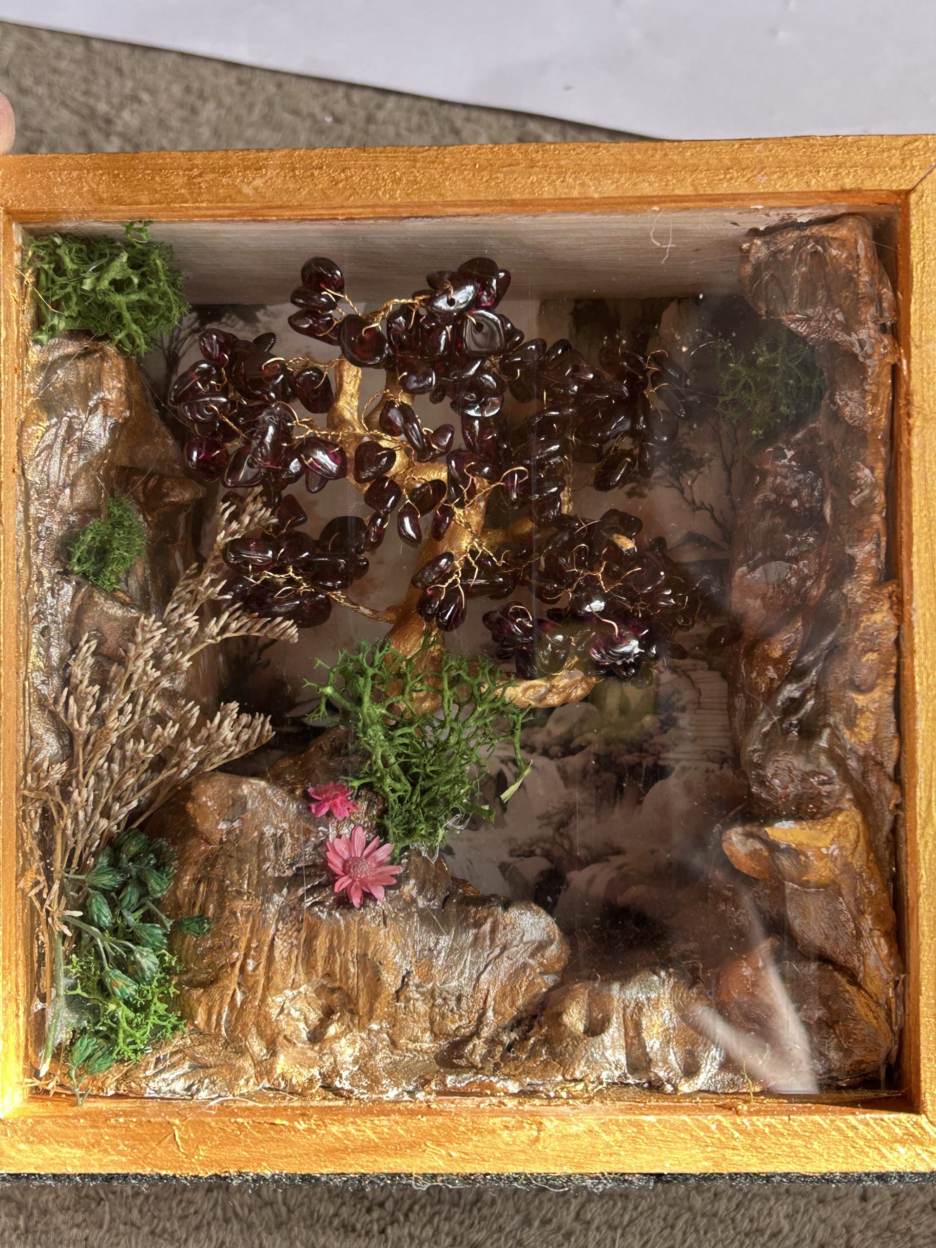 Arbre de vie artisanal en grenat – Diorama asiatique en boîte bois