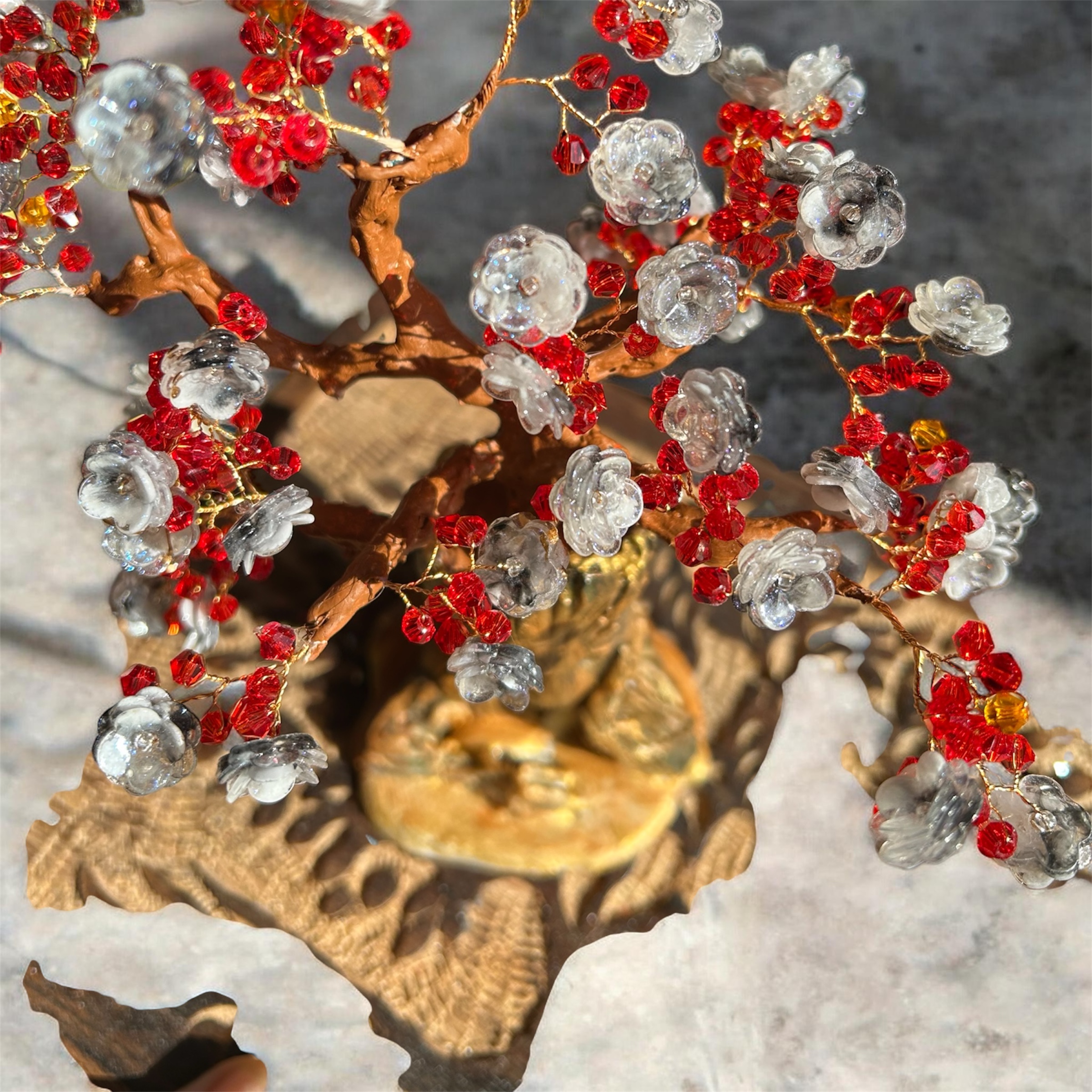Son feuillage lumineux mêle des nuances écarlates profondes à des pétales cristallins, évoquant à la fois la passion, l’énergie vitale et la pureté. Chaque branche, minutieusement sculptée, semble danser sous la lumière, créant des reflets subtils et enchanteurs qui évoluent au fil de la journée.