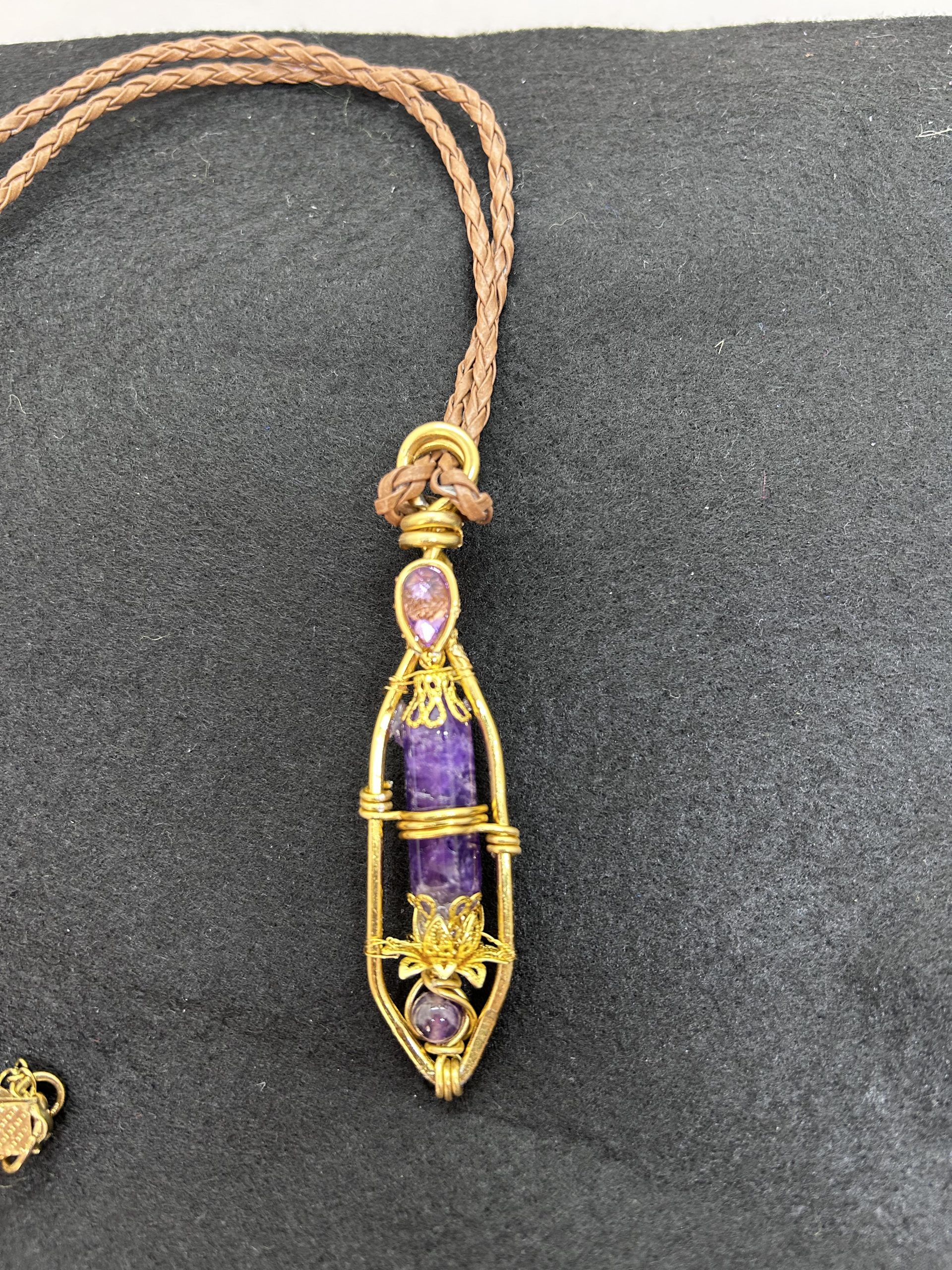 Ce pendentif raffiné met en valeur une pierre naturelle d’améthyste taillée en pointe, montée dans une structure décorative en fil doré et ornée de détails floraux stylisés. Une perle d’améthyste vient compléter harmonieusement la composition, apportant douceur et équilibre. Un strass scintillant accentue l’éclat du bijou et lui confère une touche de lumière subtile.