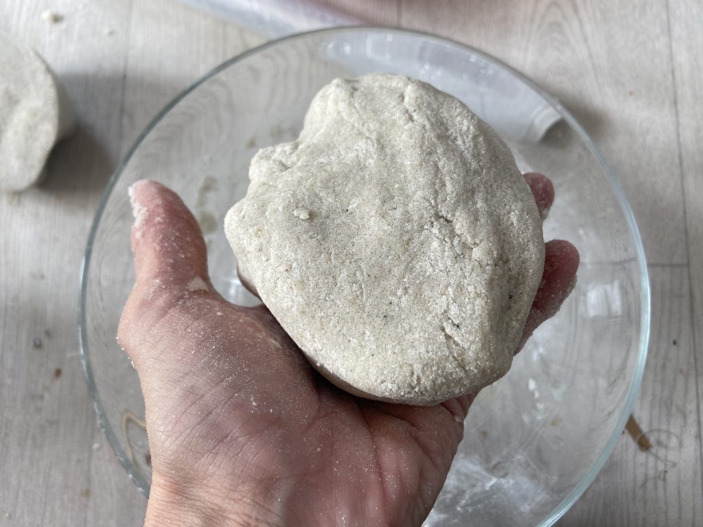 Une fois le mélange terminé, sortez-le du bol et commencez à le pétrir sur une surface légèrement farinée. Il faudra moins d'une minute pour former une boule souple et malléable très similaire au toucher et à la consistance de la pâte à modeler ou de la pâte à sel.