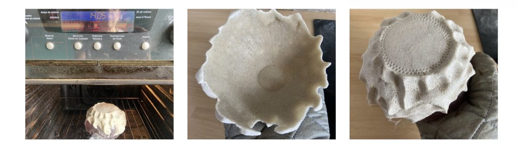 Lorsque vous êtes sûr du résultat, vous pouvez le mettre directement dans le four. J'ai réglé mon thermostat à 120 degrés Celsius et je l'ai laissés sécher en surveillant la cuisson bien sûr. Cela peut varier jusqu'à environ 4h. Tout dépend de l'épaisseur de votre création et de votre four.